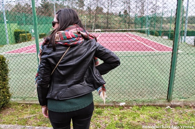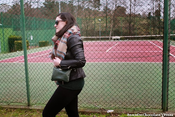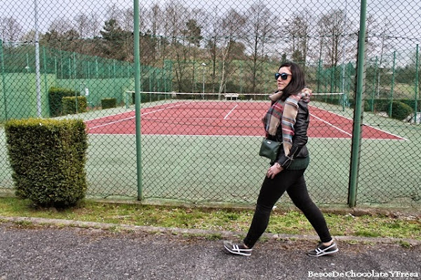 El Domingo aposte para dar un paseo con mi chico y después tomar unas cañitas con unos amigos por un look cómodo. Llevo jeans negros con sweater de punto en verde botella, sneakers y clutch a juego y bufamanta (pues el día estaba frío frío). Las fotos las hicimos al lado de unas pistas de tenis como podeis ver y ya nos entró el gusanillo, así a comprar raqueta y deporte nuevo para practicar los Domingos .... :) :)
