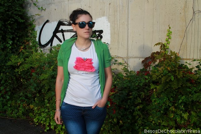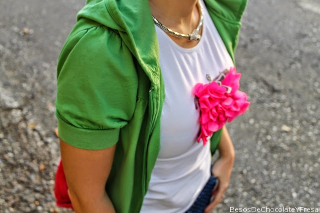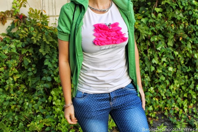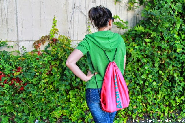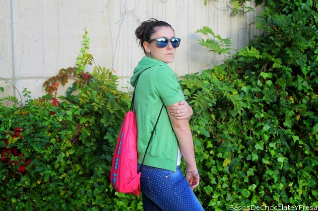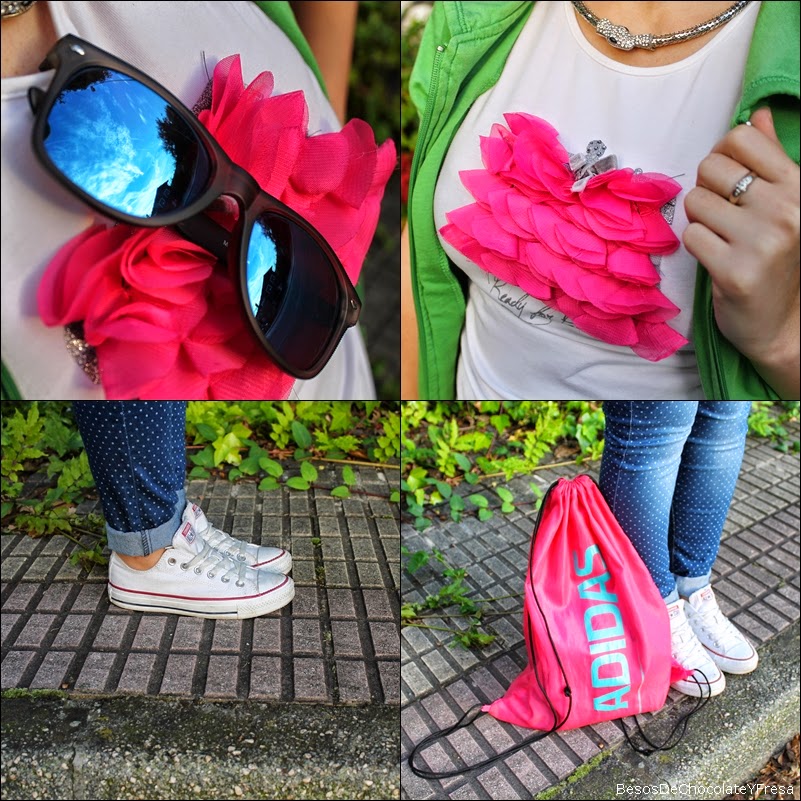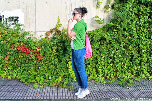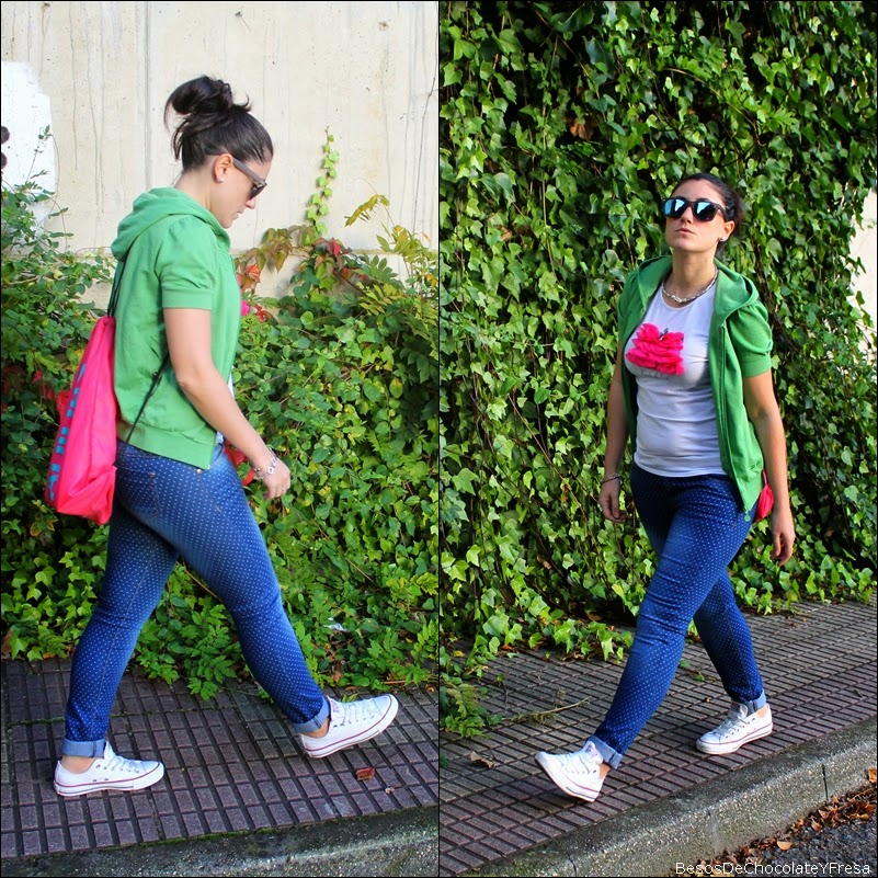 Llevo camiseta blanca con volantitos rosa y jeans de topos, sudadera de manga corta y capucha de hace un par de años y que me resulta super cómoda y mis converse, un aliado que no me saco de los pies :). Como complementos collar plateado de serpiente y mochila de Adidas en rosa y verde.