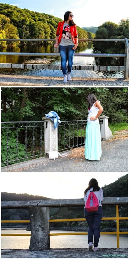 Otros outfits en los que llevo las mismas prendas son, Jeans de topos con camiseta gris de Minnie Mouse y blazer roja, Camiseta blanca con maxi falda mint y la mochila rosa con sudadera y sneakers en rosa bebe.
