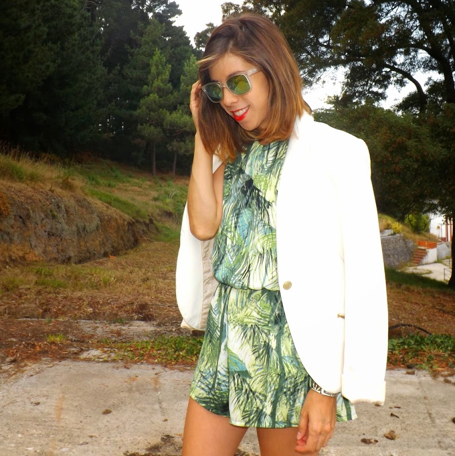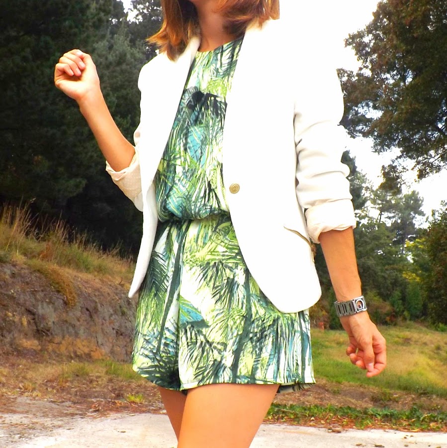 Although the days are sunny and warm here, we incorporate clothing that protects us from the fresh air at night. The summer prints remain a key of my looks and tropical has become a staple for its exotic and vibrant color blends. In today"s post, I chose white fixtures to brighten this wonderful green romper (you can also see here) that has me in love.