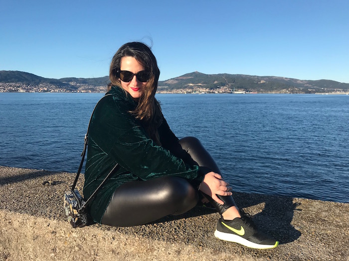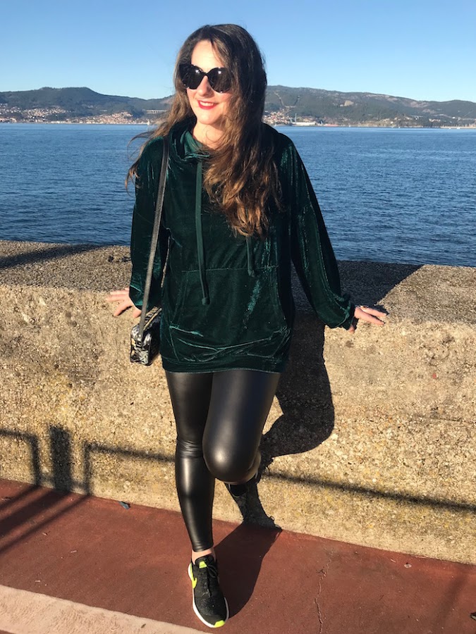 El look de hoy es un look sencillo: Loggins efecto piel, sudadera de terciopelo en color verde que ya sabéis que me chifla y deportivas. El bolso es de nueva temporada de Massimo Dutti y fue uno de mis regalos de Reyes.