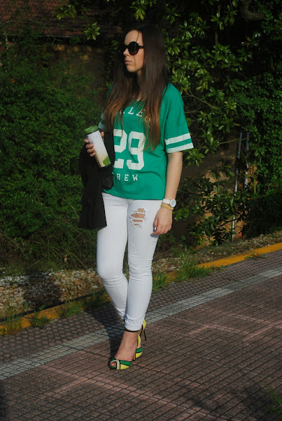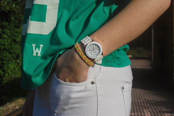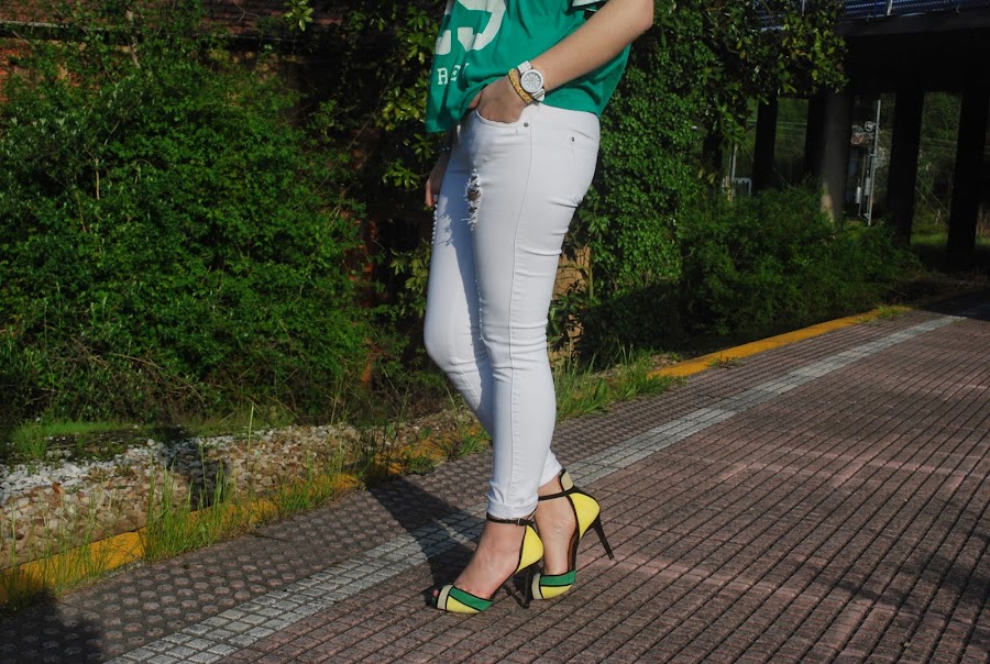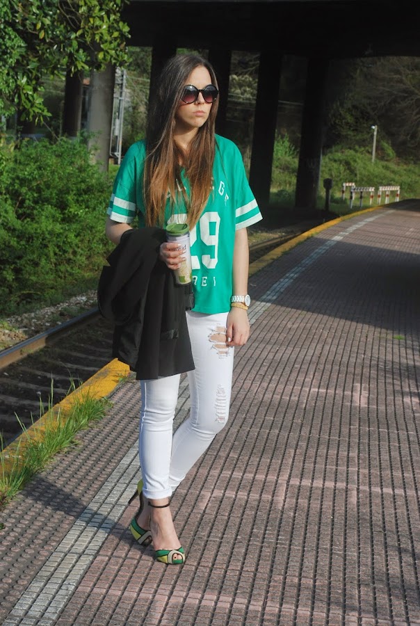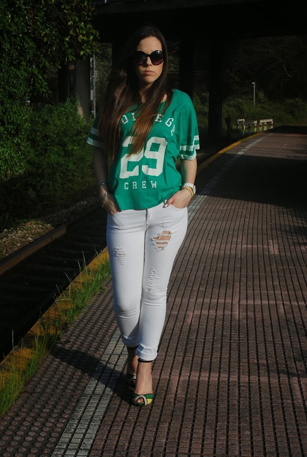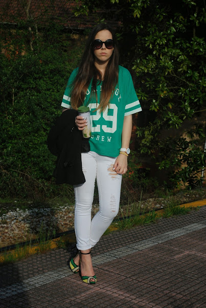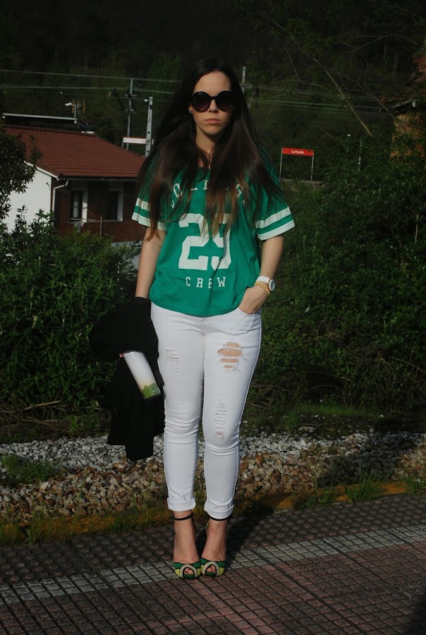 Aprovechando que hacía calor rescaté de mi armario esta camiseta inspirada en las que llevan los jugadores de fútbol americano y unos de mis zapatos favoritos. Para acompañarlos jeans blancos, gafas de sol, reloj y mi nueva pulsera (la gané en un sorteo del 3er Encuentro Blogger Beauty Asturias) de Rascayú.