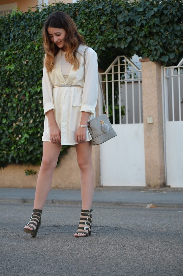 Este look no lo había utilizado nunca antes y es que opté por una americana blanca a modo de vestido y el resultado no me puede gustar más. La combiné con mis nuevos tacones en verde militar de la web PinkBasis y bolso en tono gris. ¿Qué os parece? Espero que os guste.