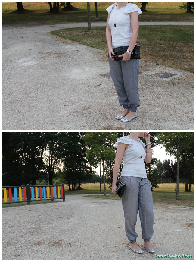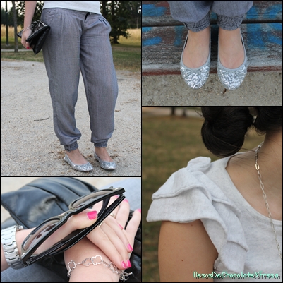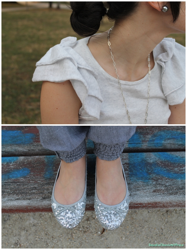 Lo combiné con camiseta básica gris con detalle de volantes en los hombros que la hacen diferente y especial y bailarinas de brillos que ya os enseñé hace un tiempo.