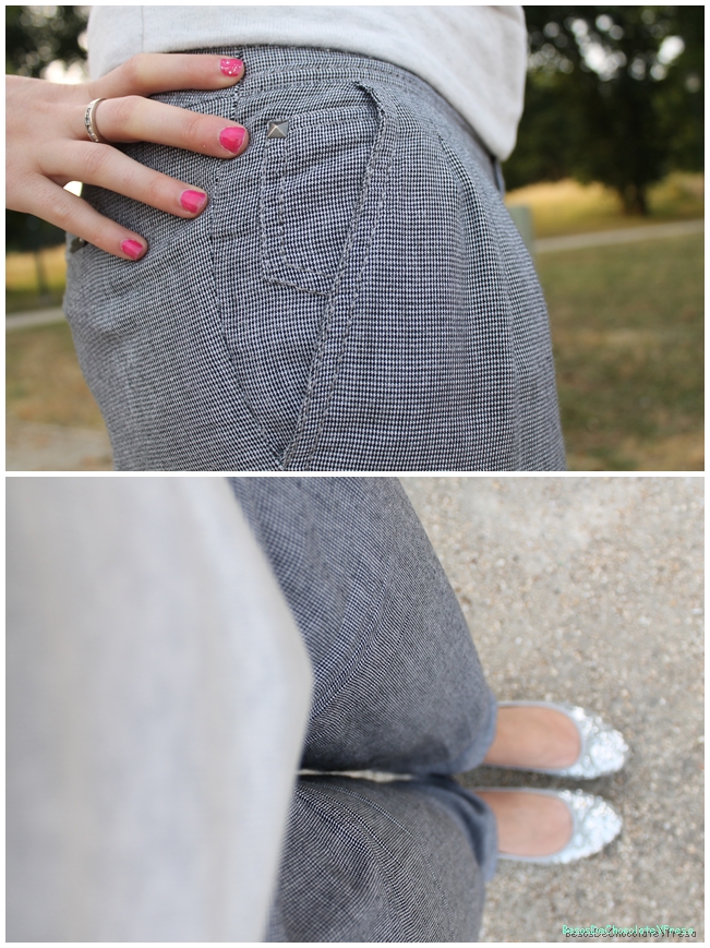 Para ello me puse cómoda con unos pantalones baggy muy fresquitos para este tiempo de color gris, con un estampado muy ligero de pata de gallo y terminados en puño en el tobillo.