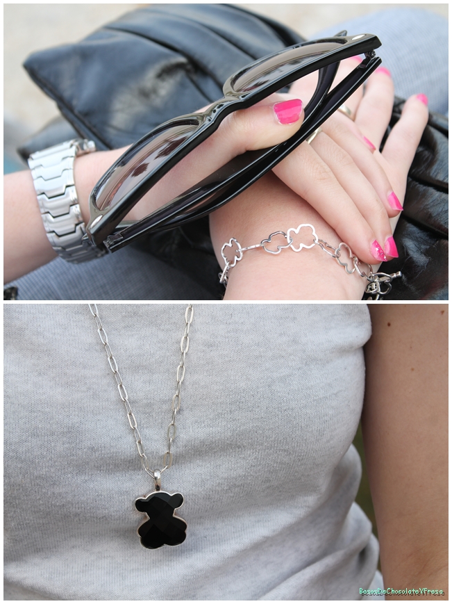 Como complementos opté por un clutch, collar del osito de Tous y gafas en negro y pulseras y reloj en plateado.