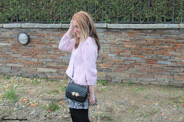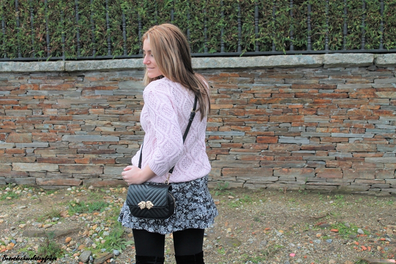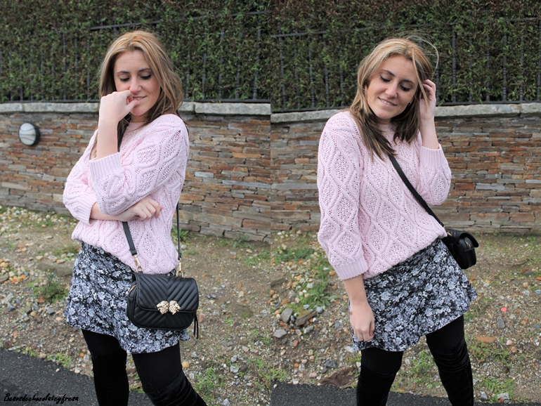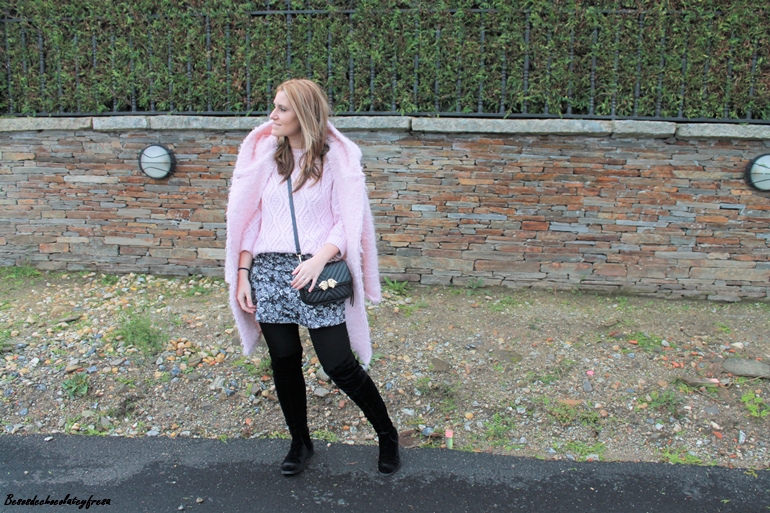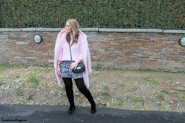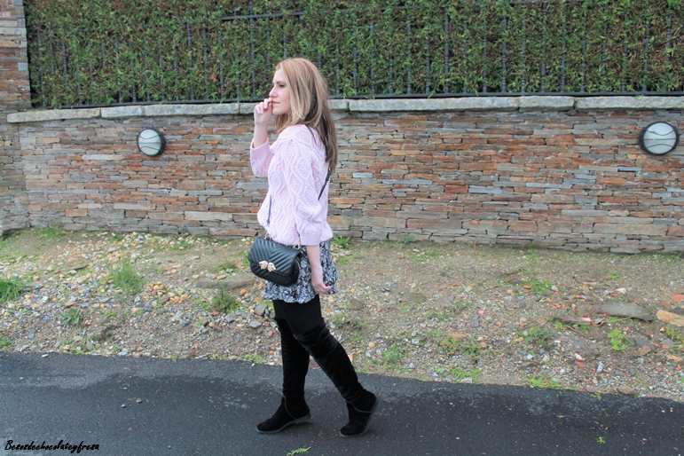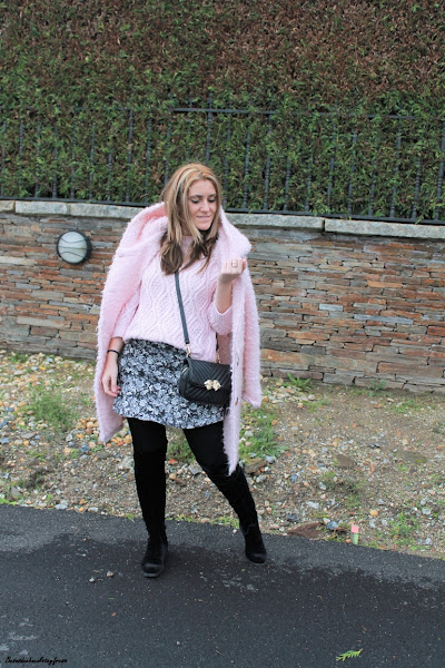 Aposté por darle algo de luz al look con rosa empolvado con un sweater de ochos en ese color, a juego con el maxi abrigo de borreguillo. Bolso y botas over the knee en color negro completan el look.