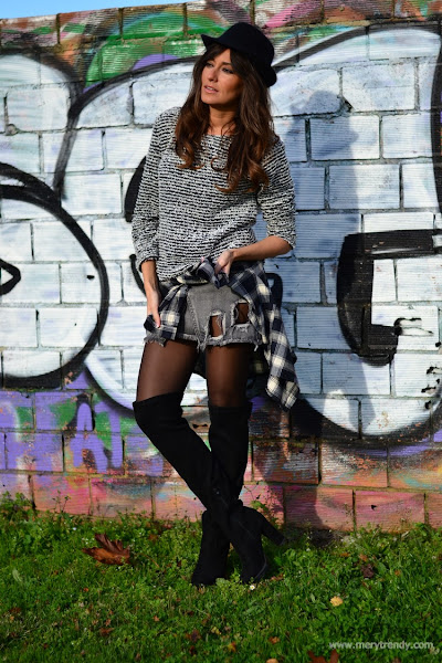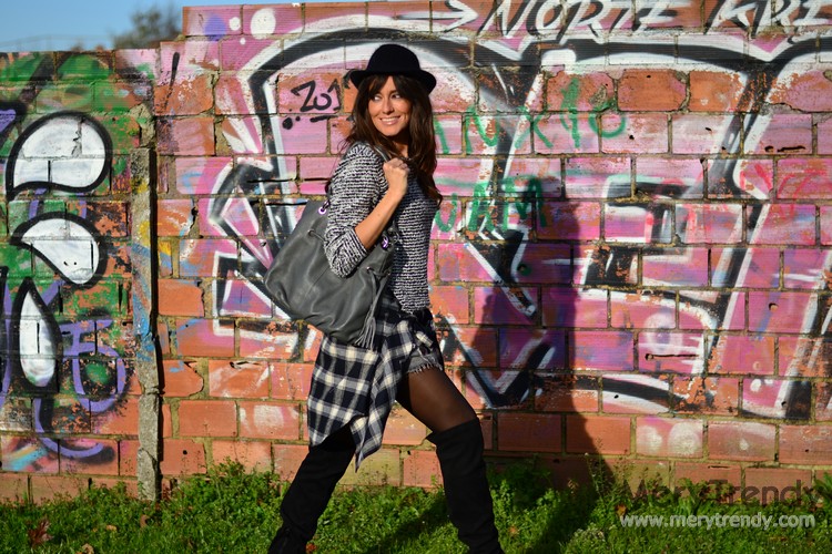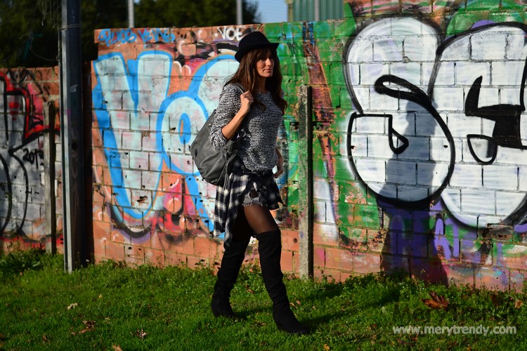 La guinda del pastel la ponen las botas y el borsalino. Los complementos en negro siempre son una buena opción. Sencilla, pero efectiva y asequible, ya que nos permite reutilizarlos en muchos de nuestros looks porque van con casi todo.