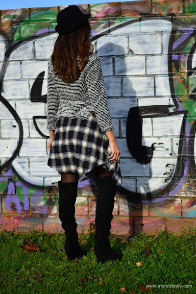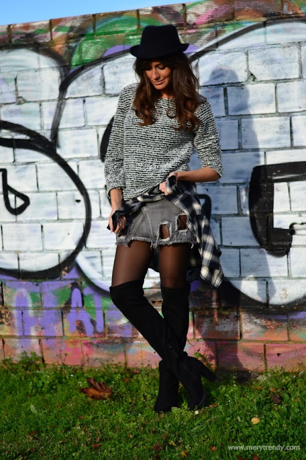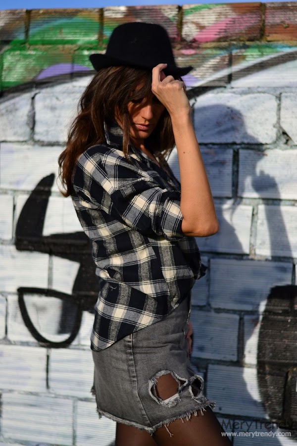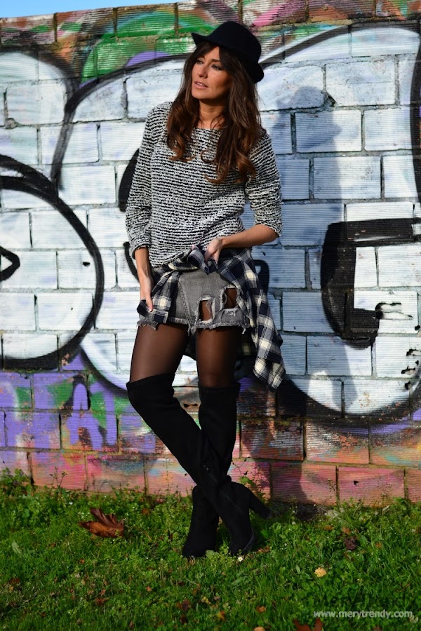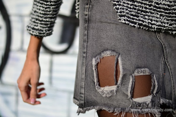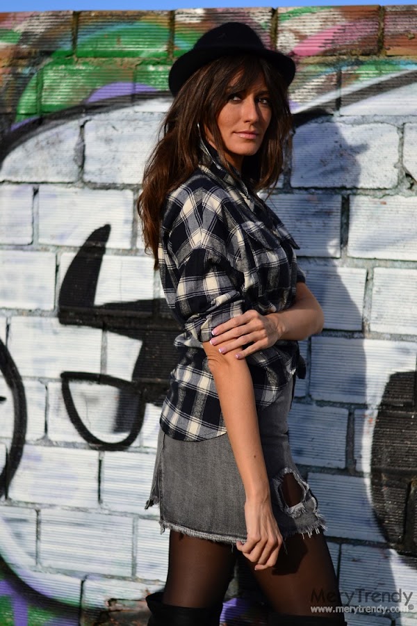 El outfit en cuestión, se mueve en la gama de los grises (uno de los colores de la temporada) y juega con los estampados (los cuadros llevan ya unas cuantas temporadas siendo una de las tendencias más aplaudidas y seguidas) y las textutas (los tejidos del jersey y el denim de efecto desgastado de la falda).