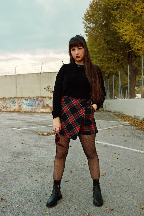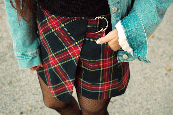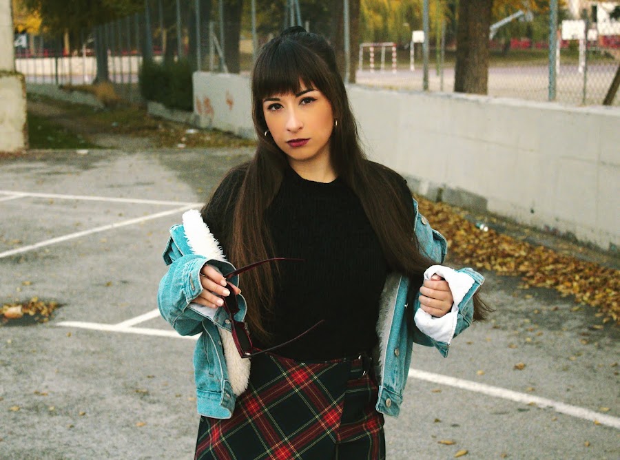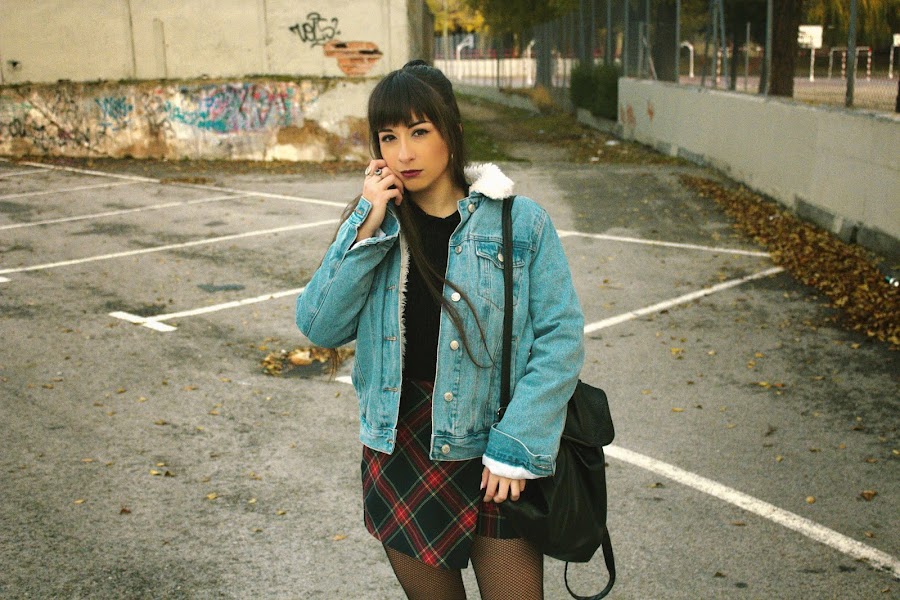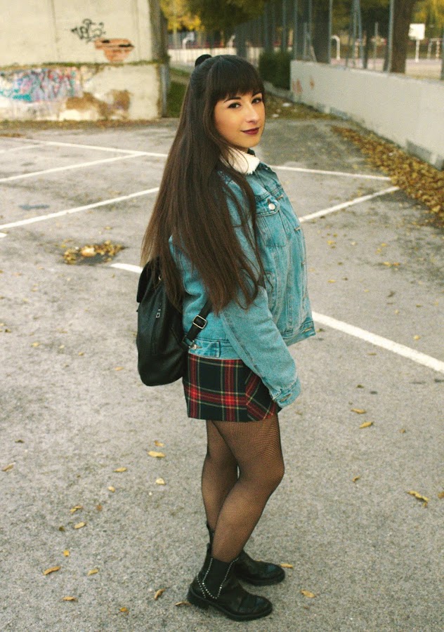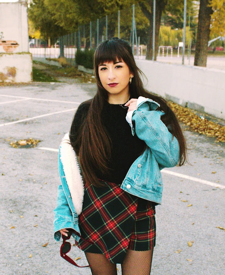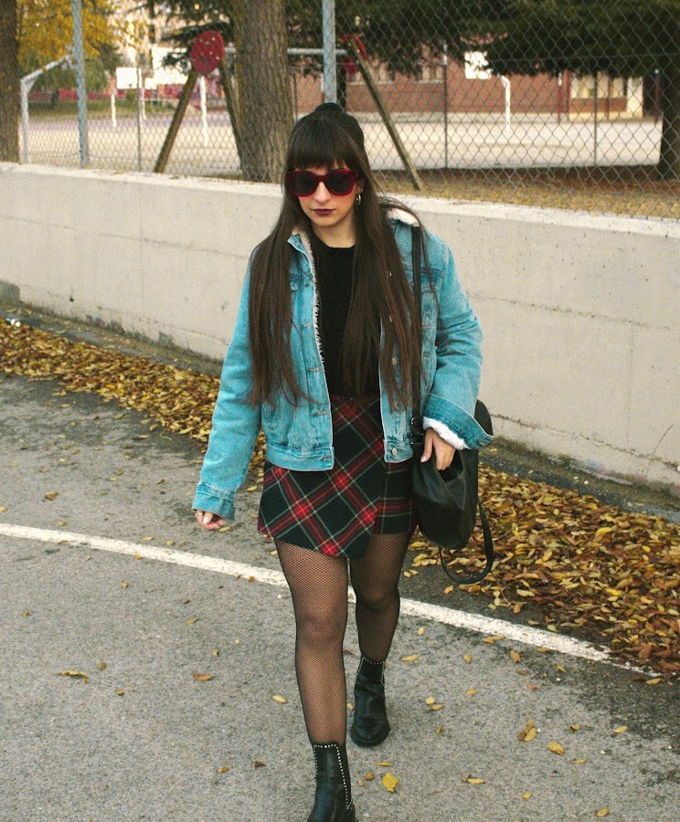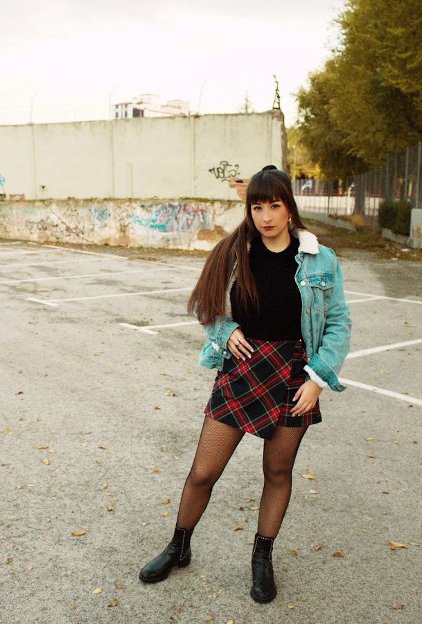 El outfit se compone de una chaqueta vaquera con borrego, jersey negro básico, falda de estampado tartan estilo uniforme, con medias de rejilla y botas negras, y algún que otro accesorio acorde.