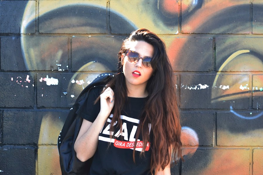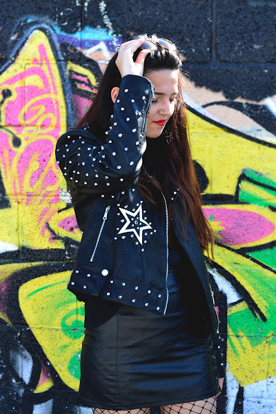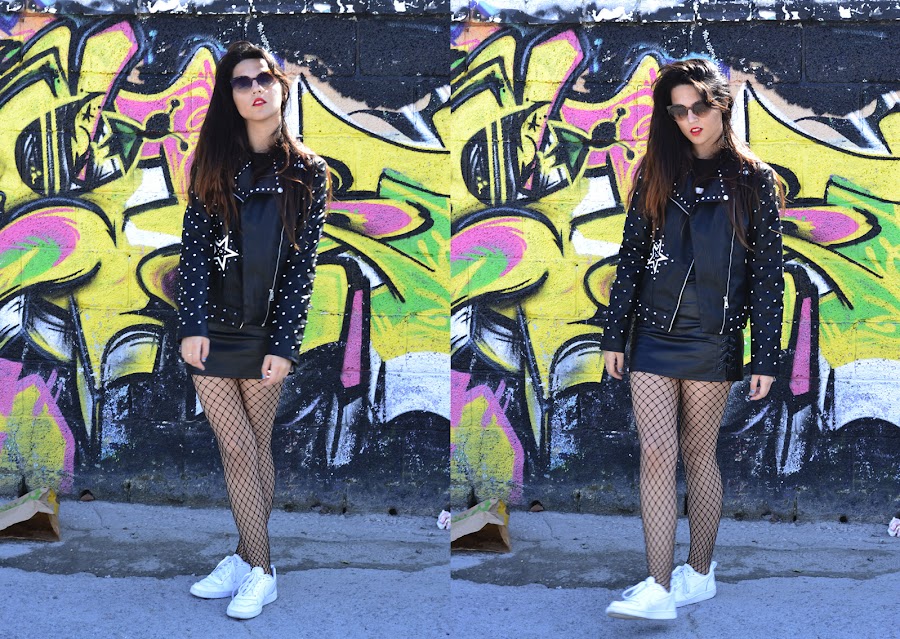 El look habla por sí solo, un total black muy cañero, nada discreto, de los que tanto me gustan a mi. Nada mejor que la combinación de la camiseta de uno de tus grupos preferidos, con una buena biker, falda de efecto piel y para darle aún mas ese toque grunge medias de rejilla bien grandes. Y mi toque personal: sneakers para todo.
