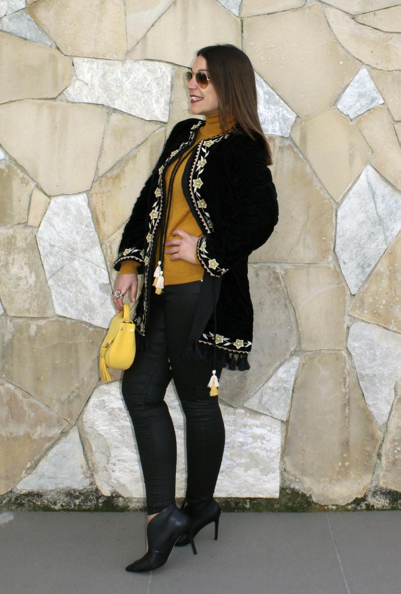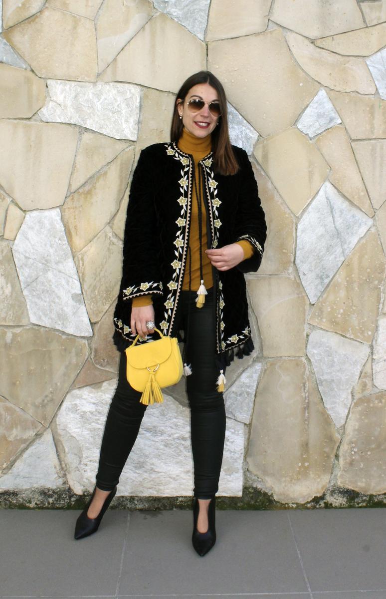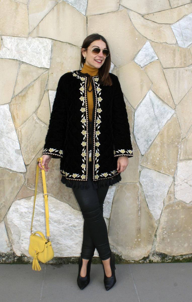 Como os decía, una pieza que no necesita mucho más, con total black queda perfecto o con un total white, pero en mi caso lo he combinado con pitillos negros y jersey mostaza similar a los tonos del abrigo.