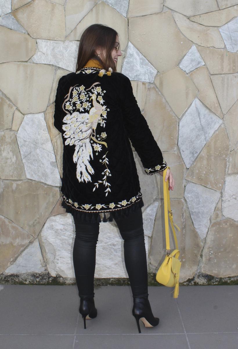 Una pieza llamativa y que poco más necesita para conseguir un buen outfit, con la espalda bordada con un gran pavo real y muchas flores,flores que dan la vuelta por el reborde de toda la pieza y los puños. Para cerrarlo lleva cordones arriba y abajo con unos pompones en los extremos.