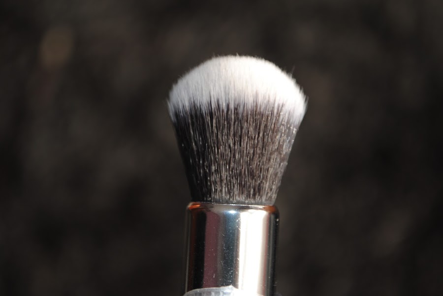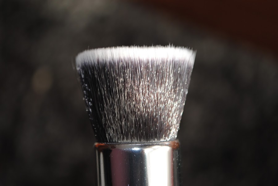 La primera que nos encontramos es la llamada "mofeta". Es una brocha muy plana que sirve para aplicar y difuminar la base de maquillaje. Hubo un tiempo que fue el boom pero últimamente se ha reemplazado por otras herramientas como la beauty blender o la esponja de silicona. Personalmente yo la sigo usando muchísimo porque voy más rápido con ella que con la beauty. Es bastante tupidita como podéis ver y funciona genial.