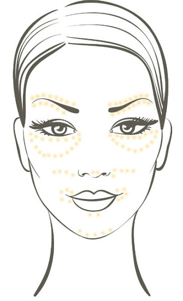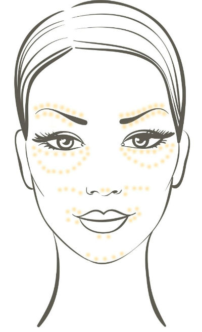 En la punta de la nariz, punto central de los labios, arco de las cejas, sien, zona alta de los pómulos y barbilla para iluminar.