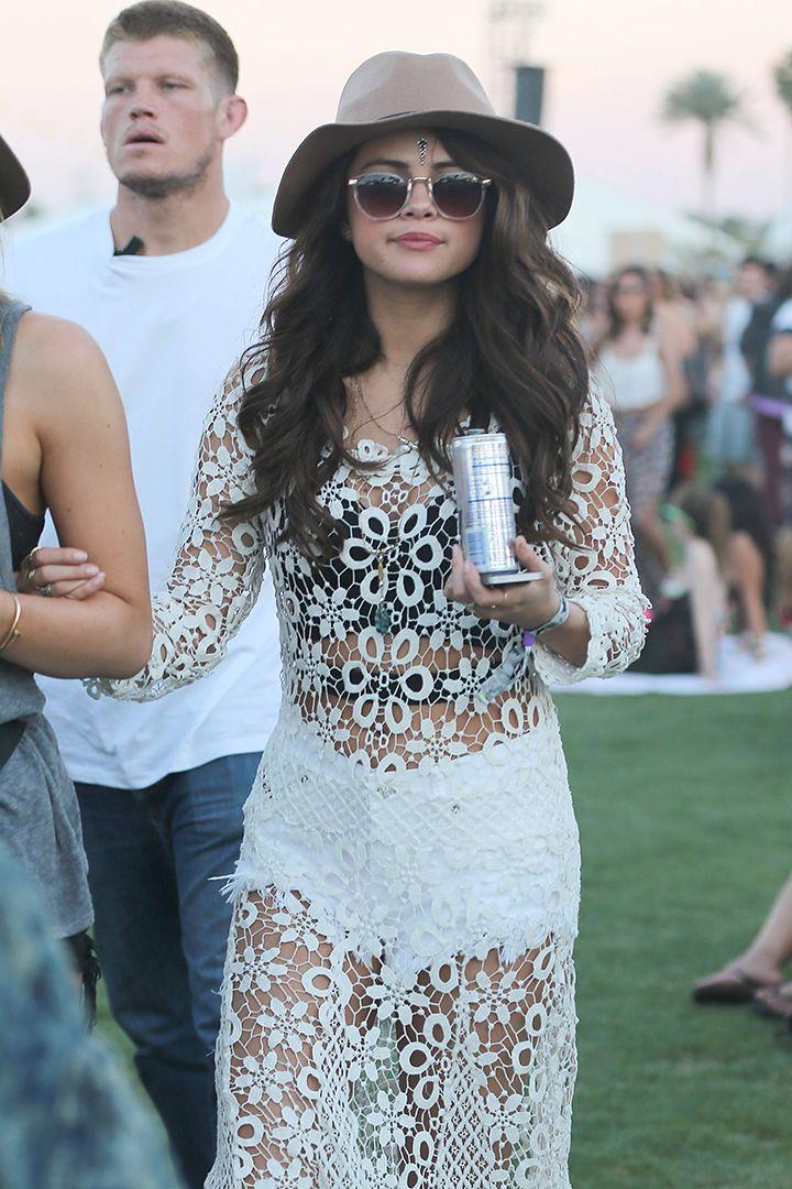 Gafas y Sombrero anchos.Eso es un must have en Coachella para tener ese hipster look.Asi como vemos a Selena Gomez con este conjuntito tan chic.Y con el charm en la frente.