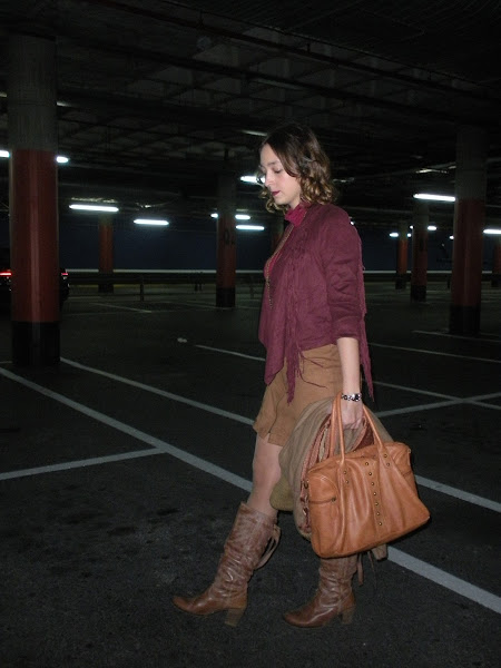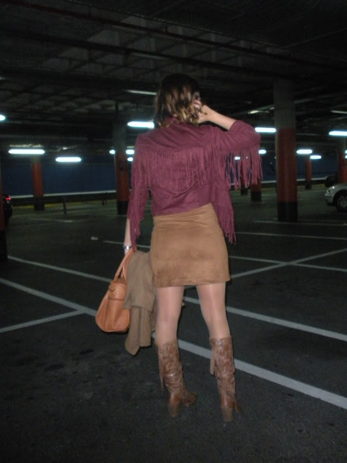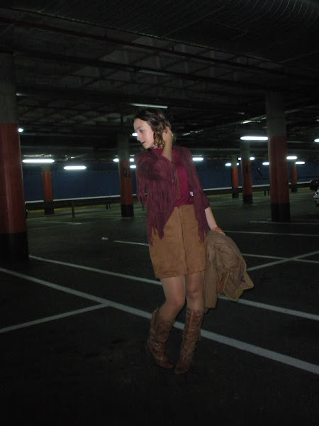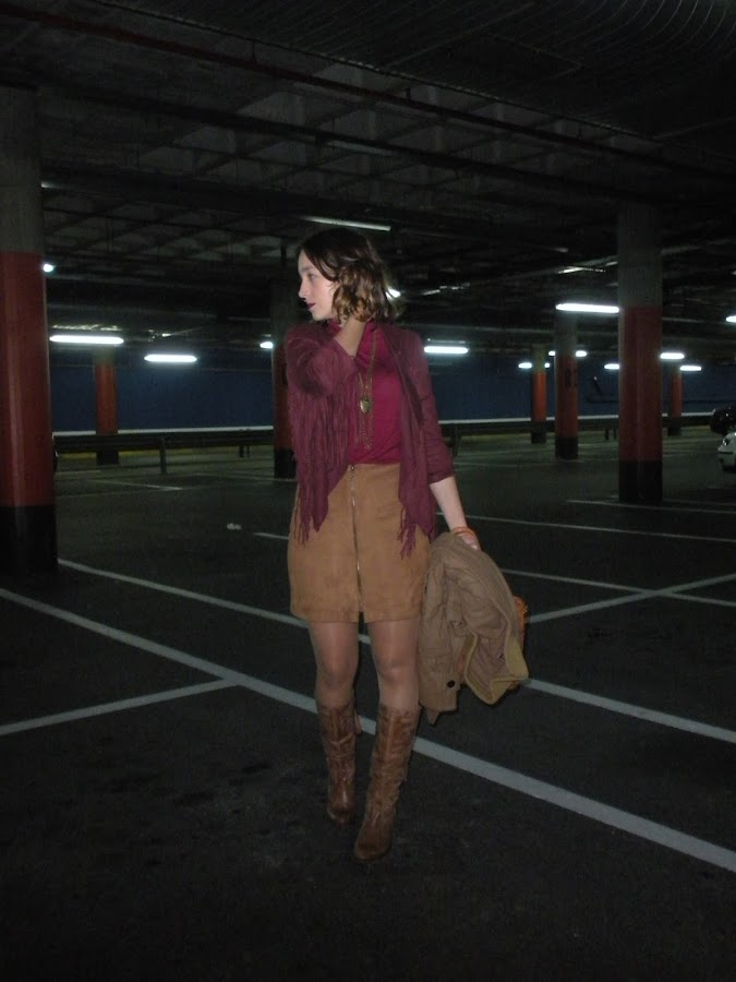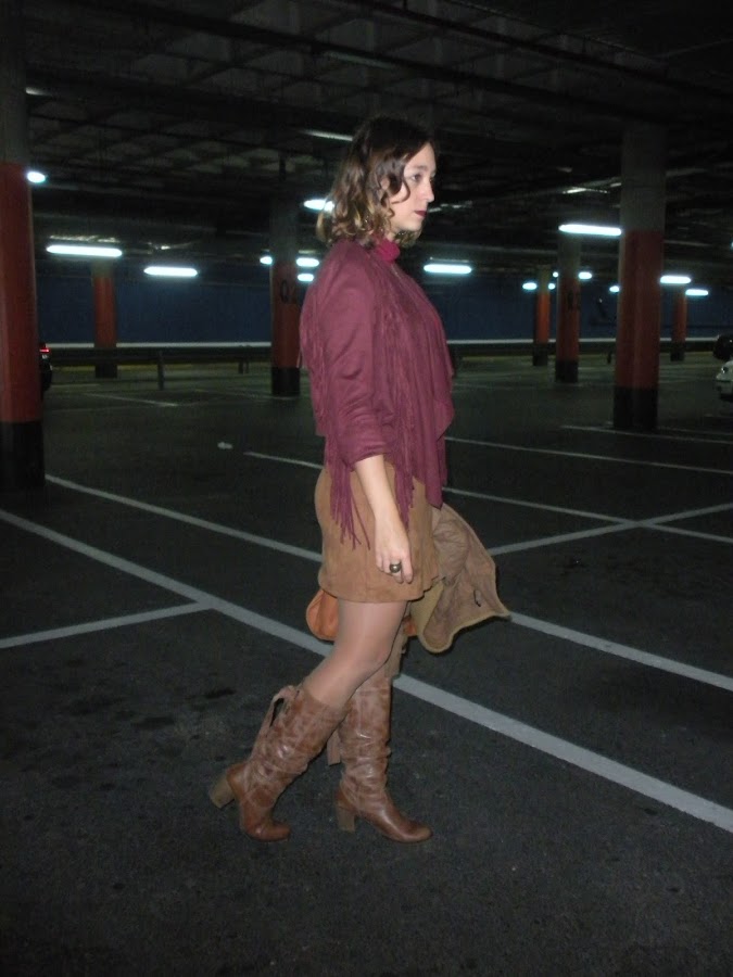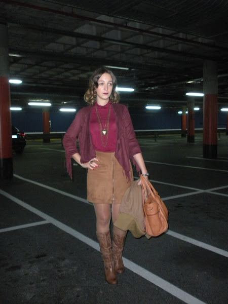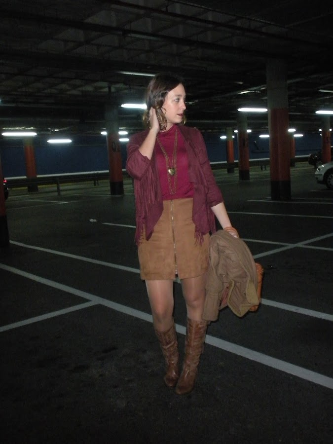 Bueno, vamos con el look de hoy: ante, flecos, falda con cremallera delantera, botas altas, cuello alto... un guiño a los 70´s en toda regla.