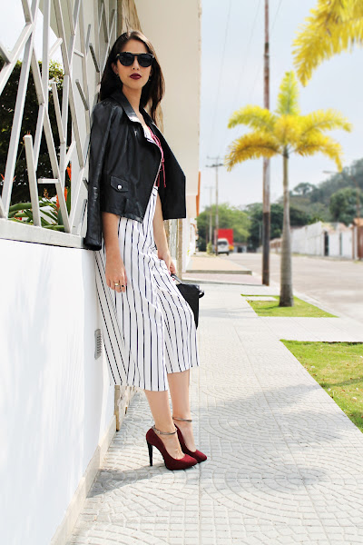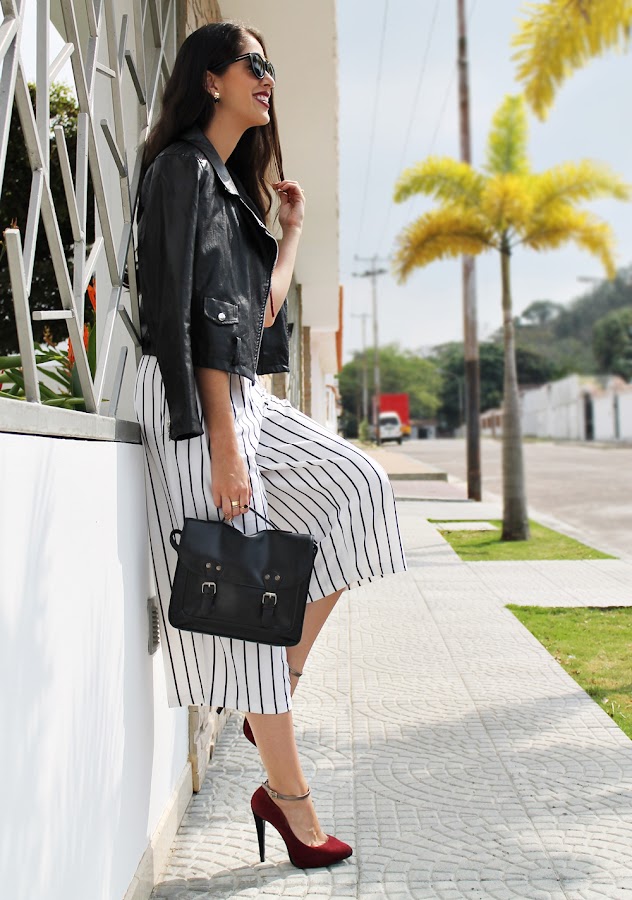 Este look lo complete con prendas tan simples y básicas como una buena chaqueta de cuero -sintético claro- unos lindos tacones, un bolso pequeño y accesorios minimalistas, no es necesario recargar tanto un look que ya dice tanto.