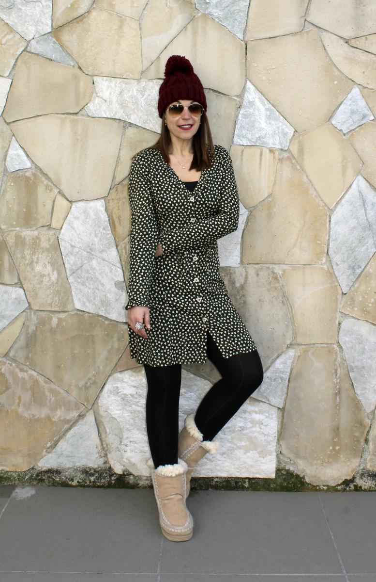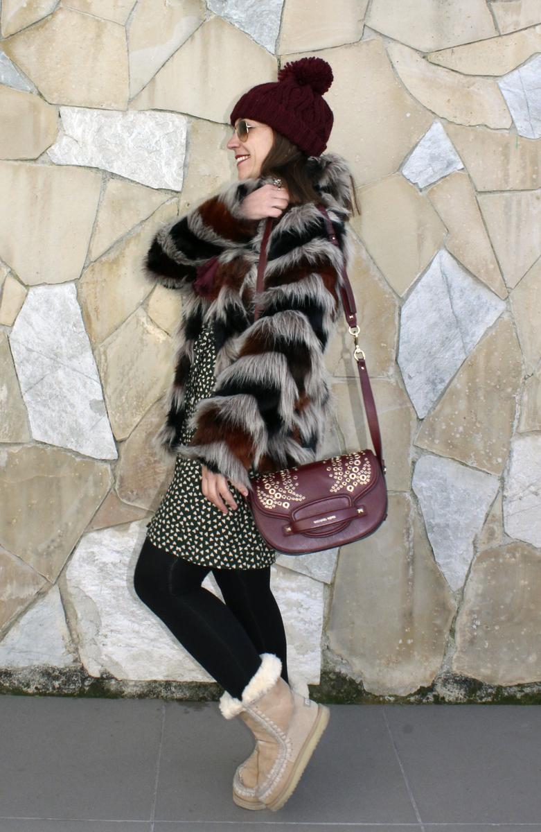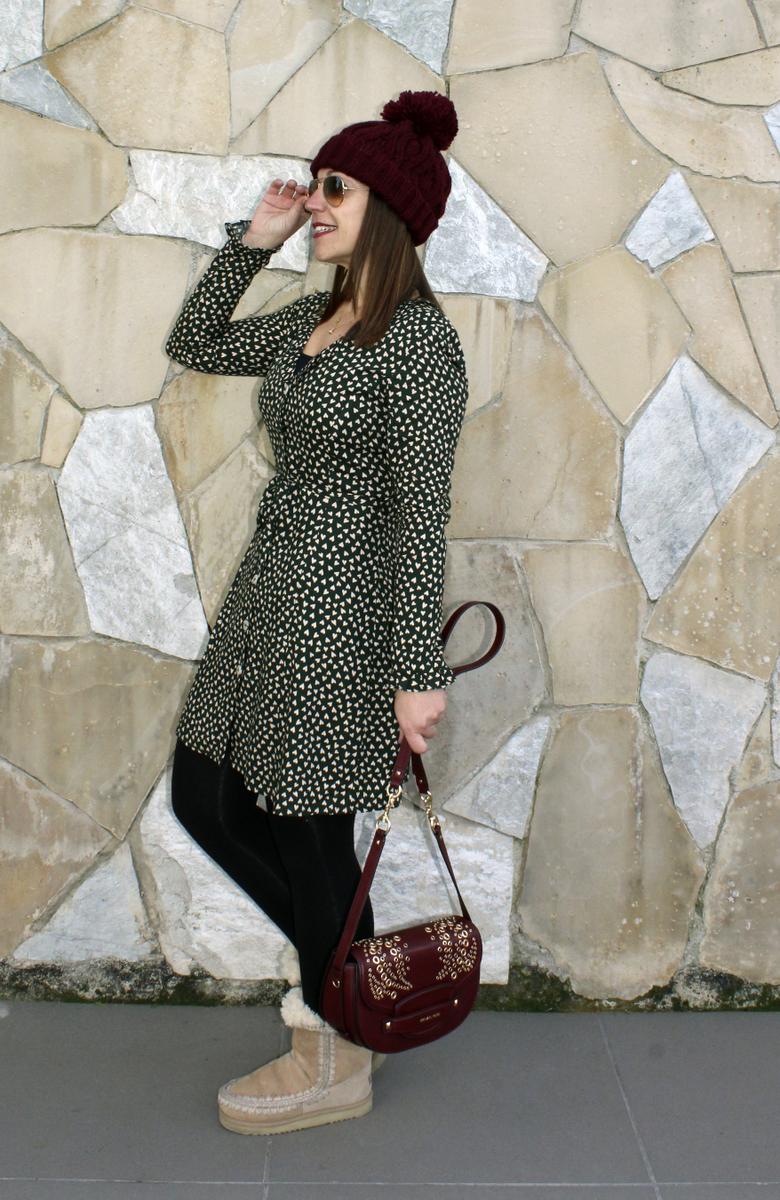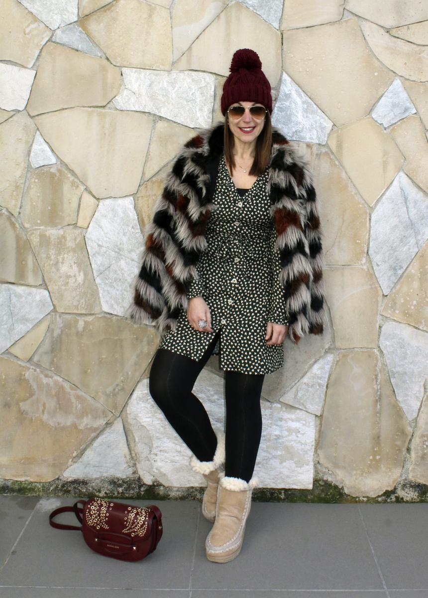 Abrigo de pelo tricolor, combinado con un vestido camisero verde musgo salpicado con pequeños corazones, regalito de los Reyes Magos ( desde luego como se notan que son magos, porque aciertan siempre!!!), botas supercalentitas de pelo y como complementos he optado por el color granate, gorro de lana, bufanda y bolso.