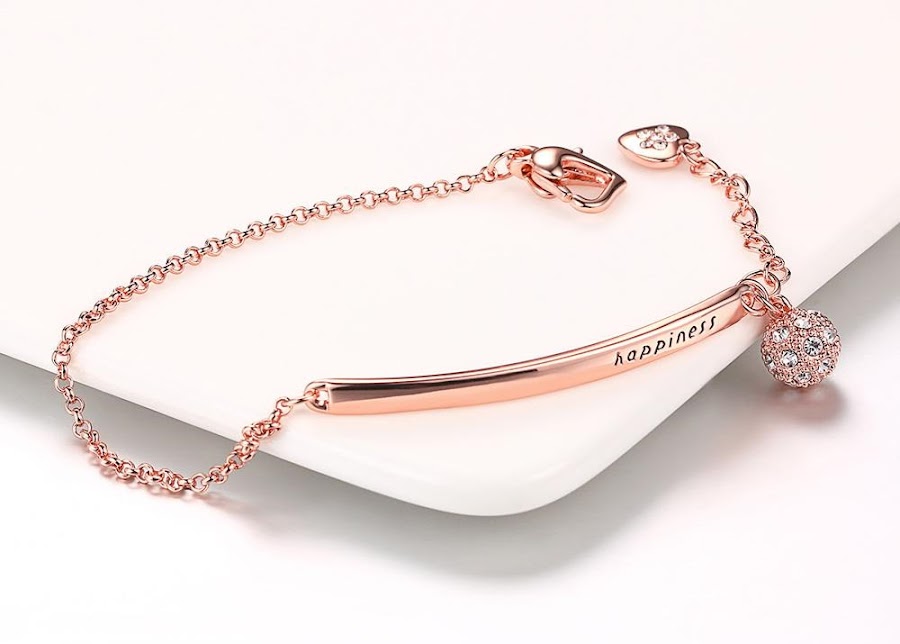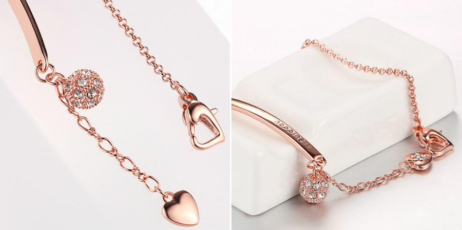Gorgeously around your wrist, this bracelet will make heads turn. This beautys rose golden color is accompanied by a nice little heart and a little crystal ball. Its originality is due to the fact of its flexibility. Not only can you wear this on a casual day, but you could also wear this on a chic night. Then again, who wouldnt want to look amazing on every occasion? As it represents itself, this beautifully engraved jewelry will bring Happiness to every womans life.