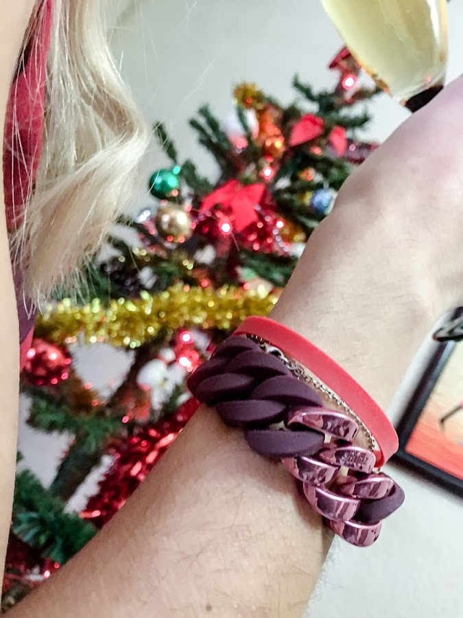 Como complementos, he apostado por unas pulseras de THE RUBZ de los mismos colores, una de eslabones en color morado y una pulsera roja, más fina y con un adorno dorado.