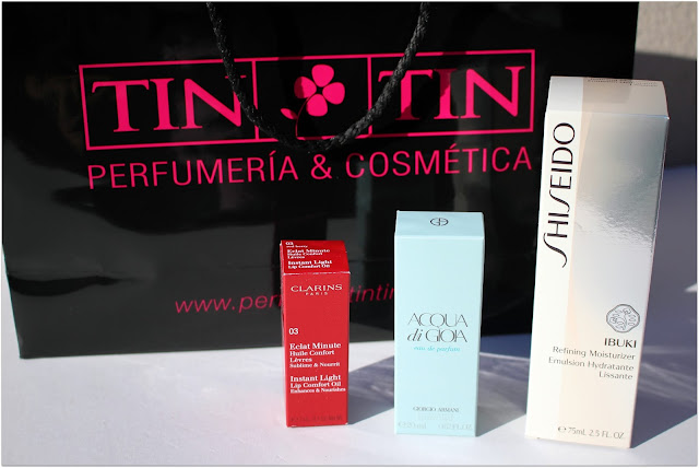 Perfumerías Tin Tin, que probablemente no os suene porque está en las Islas Baleares, nos dio este pedazo de regalo en forma de una colonia en minitalla de Giorgio Armani, un tratamiento para labios de Clarins y una crema fluida para rostro de Shiseido. No he podido evitar estrenar ya la crema de Shiseido, ya os contaré.
