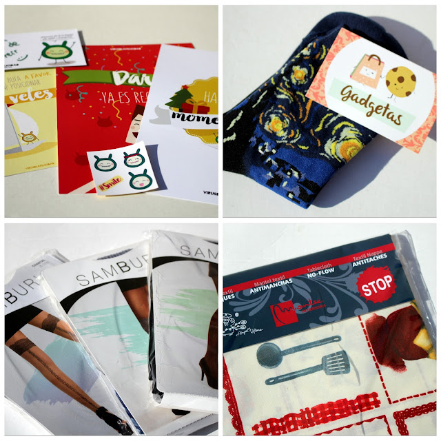 El Virus de la Felicidad nos regaló láminas positivas y unas pegatinas, Gadgetas nos obsequió con unos calcetines muy chulos (a mi me tocó La Noche Estrellada de Van Gogh), Cecilia de Rafael nos envió tres medias chulísimas y, por último, Montse Interiors nos regaló un mantel antimanchas y una bolsa plegable.
