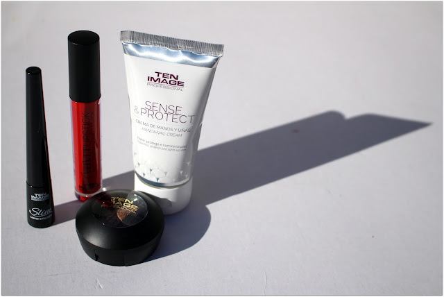 La siguiente empresa colaboradora fue Ten Image, que nos cedió cuatro de sus productos para probarlos, que son una delineador líquido, un labial rojo, una sombra cobriza y una crema de manos.