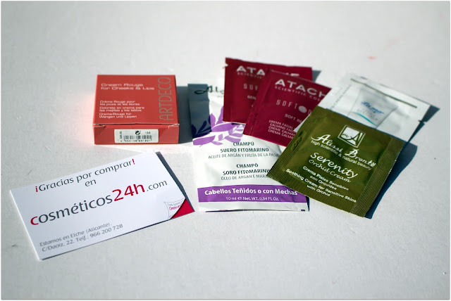 Cosméticos 24h nos hizo un test a cada una para enviarnos productos personalizados. Mi talla original fue un colorete de Artdeco que también sirve para labios, y varias muestras de cremas y champús. Algo debí contestar mal, pues no acostumbro a usar este tipo de coloretes, pero es de agradecer de todos modos.