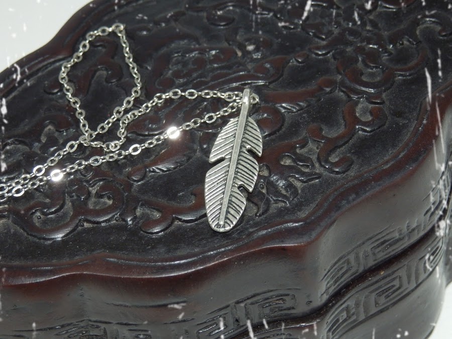 El siguiente colgante que os enseño es muy, muy simple pero precioso. Es un colgante que tiene la cadena muy finita con los eslabones muy chiquiticos y el detalle que lleva es el de una pluma.