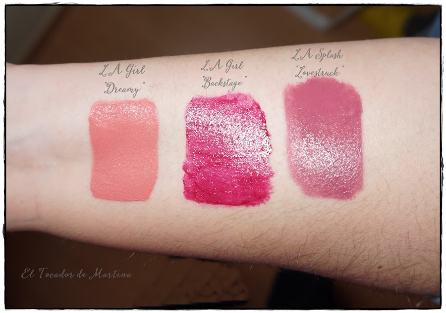 Nada tienen que ver los labiales de las dos marcas, los de LA Splash son bastante más caros, pero también de una calidad muy superior, de hecho con los de LA Girl no pienso repetir nunca más. Os enseño los swatches y ahora detallo un poco más: