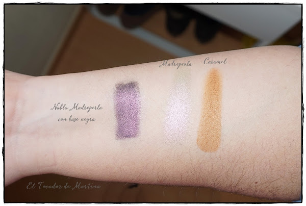 A continuación os enseño swatches de ambas sombras, y en el caso de la Madreperla os la enseño por sí sola y con una base de lápiz negro debajo, para que veáis cómo se puede llegar a transformar: