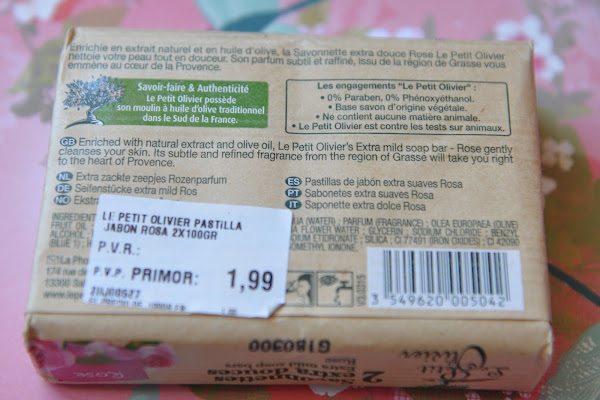 Otro producto que compré son pastillas de jabón para manos (aunque también lo usamos en la cara ) se trata de los jabones de Le Petit Olivier, lo compré de dos olores,éste de rosa y otro de flor de naranjo que es el que estamos usando en casa.