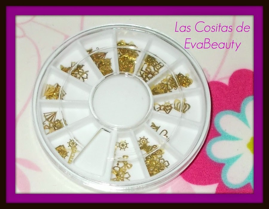 Otra ruedita monísima para decorar nuestras uñas. Trae diferentes formas, todas en dorado, como corazones, lazos, paraguas, timones, flores, tréboles, coronas,... En la foto de la web se ven de Hello Kitty pero a mí no me tocaron :( Mandan 12 estilos random. Seguramente compraré otra a ver si tengo suerte, porque son baratitas.