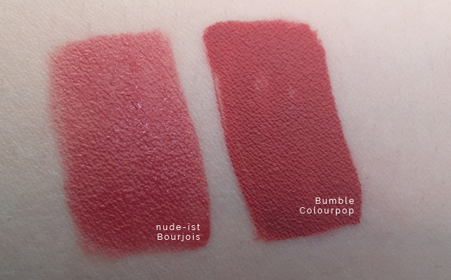 Bumble es el tono que compré para mi madre pero que al final creo que se quedará cerquita. Se parece muchísimo al Nude-ist de la gama Velvet de Bourjois, aunque quizás sea menos rosado y más amarronado: os dejo aquí una foto comparativa de ambos.Me siento más cómoda con esta tonalidad que con la otra, aunque sea uno de mis habituales. ¿Porqué? Porque el tono más apagado se camufla mejor con la piel y para un maquillaje muy potente de ojos o para darnos una buena cara... ¡fetén!