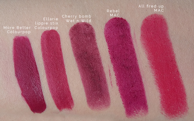 Uno de los más célebres de la marca, por lo que veo y leo, y no podía ser casualidad. Es un color que a cada quien le sienta de un modo, más borgoña, más violeta, más rojizo... A mí me queda sobre la piel muy violeta pero en el labio tiende a frambuesa. Hay que dar un par de pasadas para que cubra por completo, pero ni se apegotona ni se mueve la capa anterior. Todos secan a los escasos 30 segundos, cosa que me encanta porque si gesticulamos en las comisuras no da tiempo a que se acumule. Os dejo aquí swatch comparando con otros tonos para que os hagáis una idea. No hablo de clones, sino de tonos orientativos para que, si tenéis alguno de ellos, sepáis por donde se mueve More Better.
