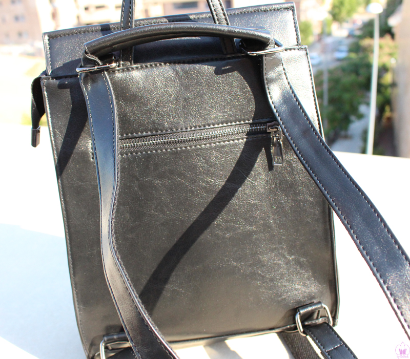 La mochila en este caso la elegí negra, porque ya tengo una en beige, otra en gris y no podía faltarme una negra. Tiene una muy buena calidad, buenos acabados imitación a piel y por dentro, varios apartados para tener organizadas las cosas, además del bolsillo de atrás, el que veis en la foto, que es útil para llevar algo que quieras tener más a mano, sin tener que abrir la mochila.