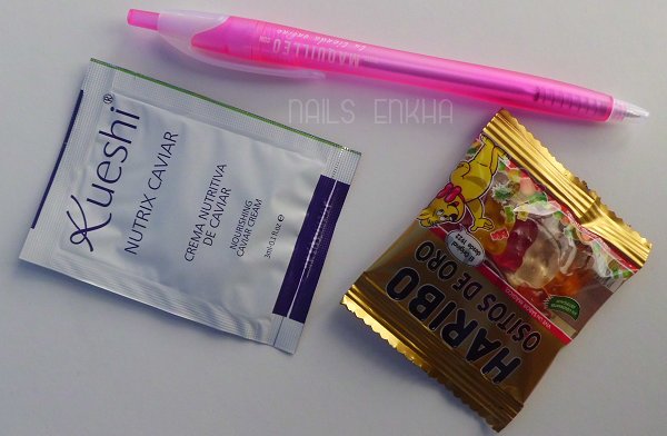 De regalo me mandaron una muestra de la crema de caviar de Kueshi, los ositos que mandan en todos los pedidos y además esta vez me han enviado también un boligrafo.