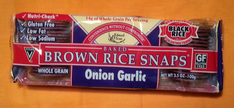 5) Edwad & Sons, Baked Brown Rice Snaps, Onion Garlic: Galletitas de arroz negro con sabor ajo y cebolla. Sin gluten, bajas en grasa y en sodio, vegetarianas,... Me gusta la cebolla y el ajo así que me decidí a probar estos snacks, de momento solo os voy a decir que no pienso repetir. Trae 100g y cuestan 3"09? (unos 2"27?).
