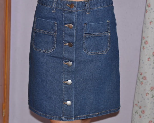 Falda tipo tubo o lápiz con botones en el centro y de largo hasta por encima de las rodillas.LLeva bolsillos delanteros,su tejido es tela vaquera más fina que un pantalón y no es nada rígida.No lleva elastano y da bastante talla.