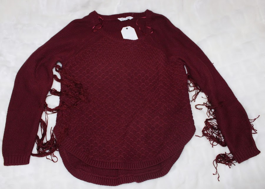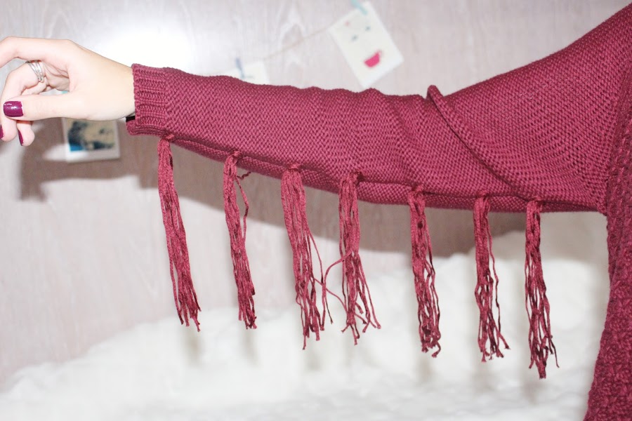 En lefties me entró la inspiración y decidí que no quería más jerseys simples porque luego siempre voy vestida igual (jersey normal, jeans y botines). Y, mientras estaba pensando esto, vi este jersey! Color burdeos (que me encanta) y original con los flequitos en las mangas.