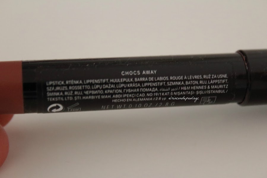 Me he pillado este lapiz de H&M, por que se lo habia visto a una youtuber y no dude en comprarmelo. Es el tono Chocs Away, como ven en la foto, y la verdad que tengo que decir que es bastante seco, así que yo lo que hago es aplicarme encima un gloss de brillo para que le de un poco de vida a los labios. Su precio es de alrededor 5