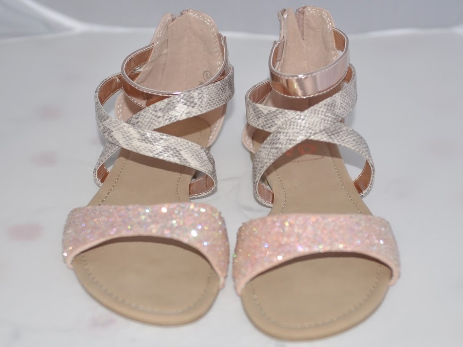Me encantan con esos brillantes en la zona de los dedos,y las tiras de atrás son estilo "piel de serpiente" y la que engancha el tobillo tipo "metalizado"