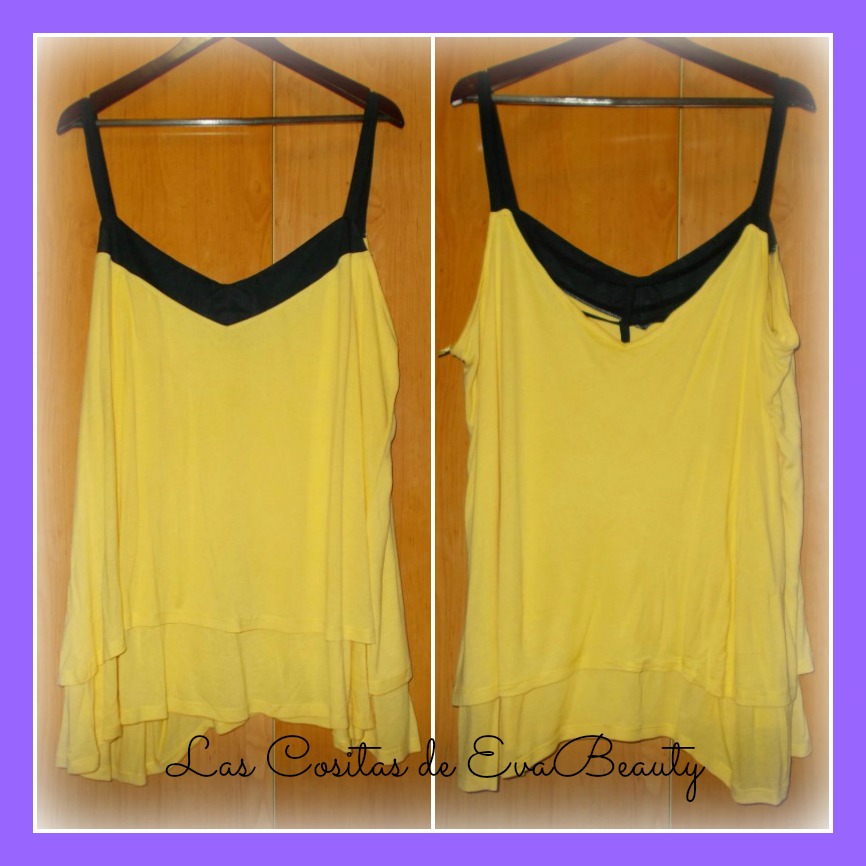 Bueno, comienzo con éste top de tirantes con detalle en la espalda de tiras cruzadas negras. Me gusta el corte que tiene, ya que estiliza la figura y queda ancho. La tela es muy fresquita.