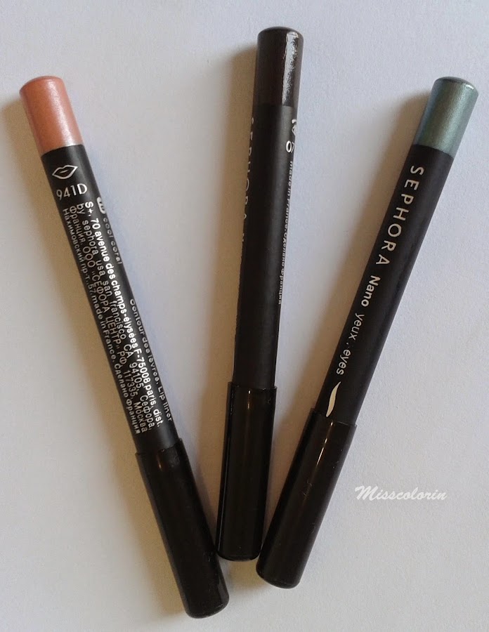 Tres mini-lápices, uno para labios y dos para ojos. El tamaño es la mitad de un lápiz normal, pero van bien para el neceser o para el bolso