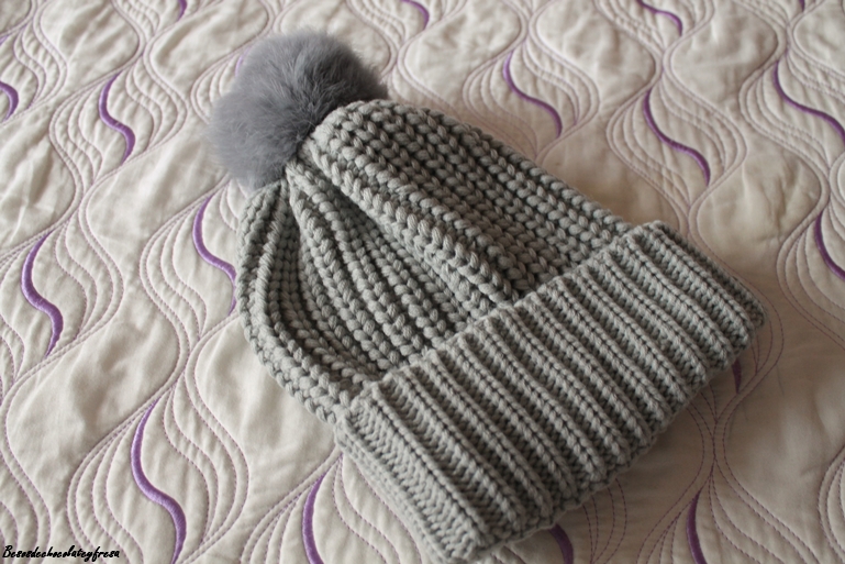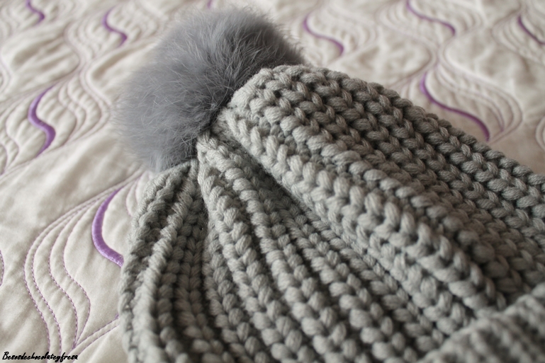 Gorro de punto con pompón de peluche en gris clarito, súper calentito y versátil que pudistes ver en un post combinado con tonos rosas. (Aquí)
