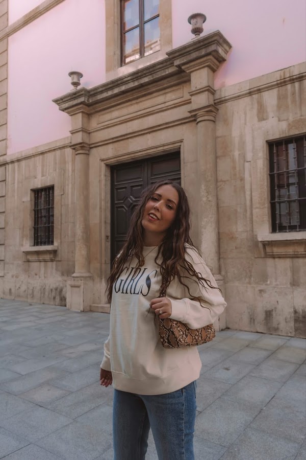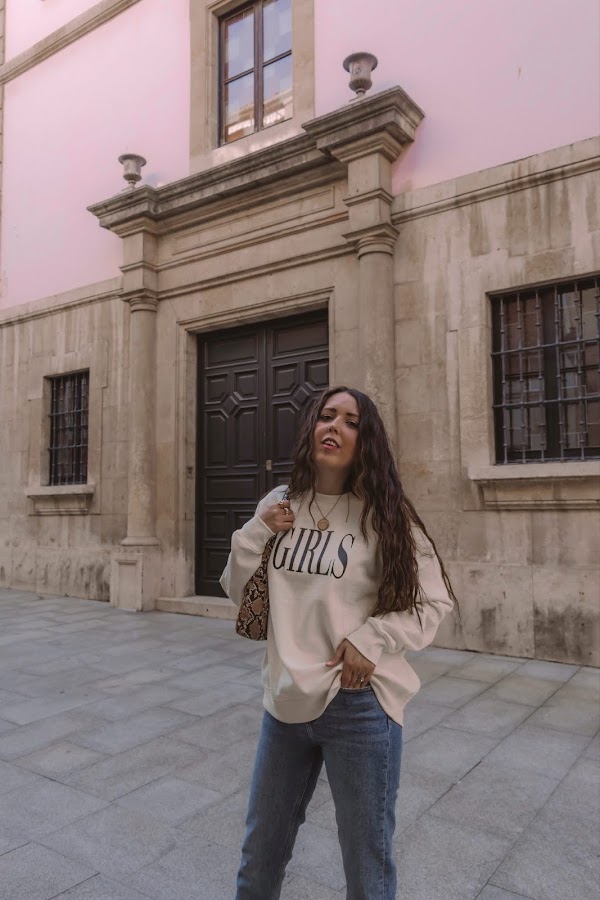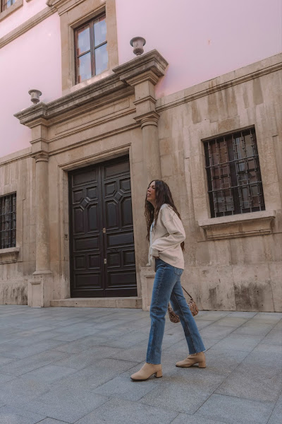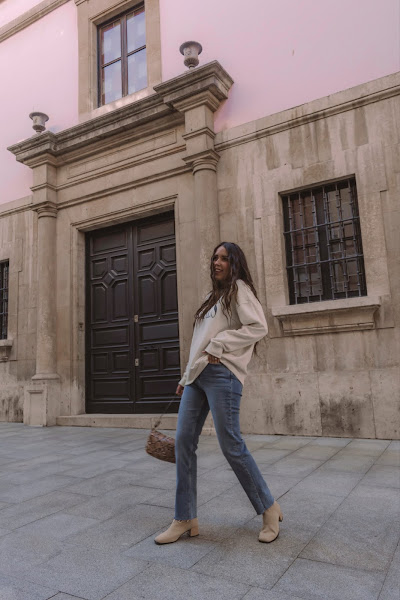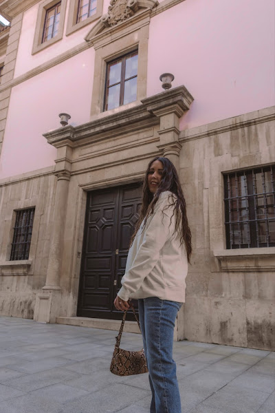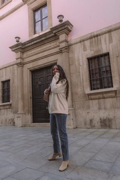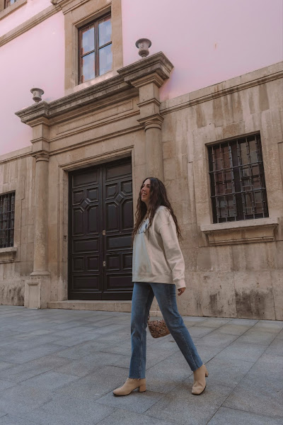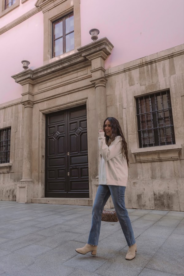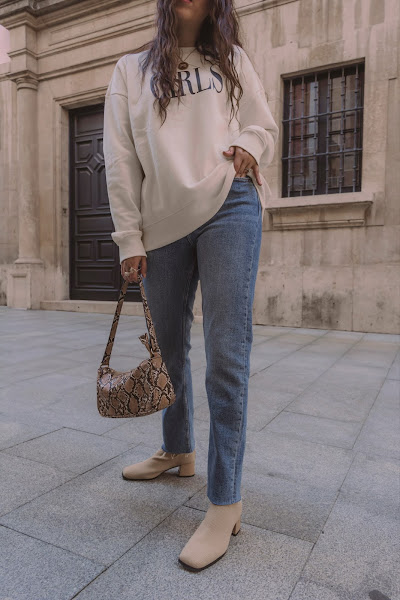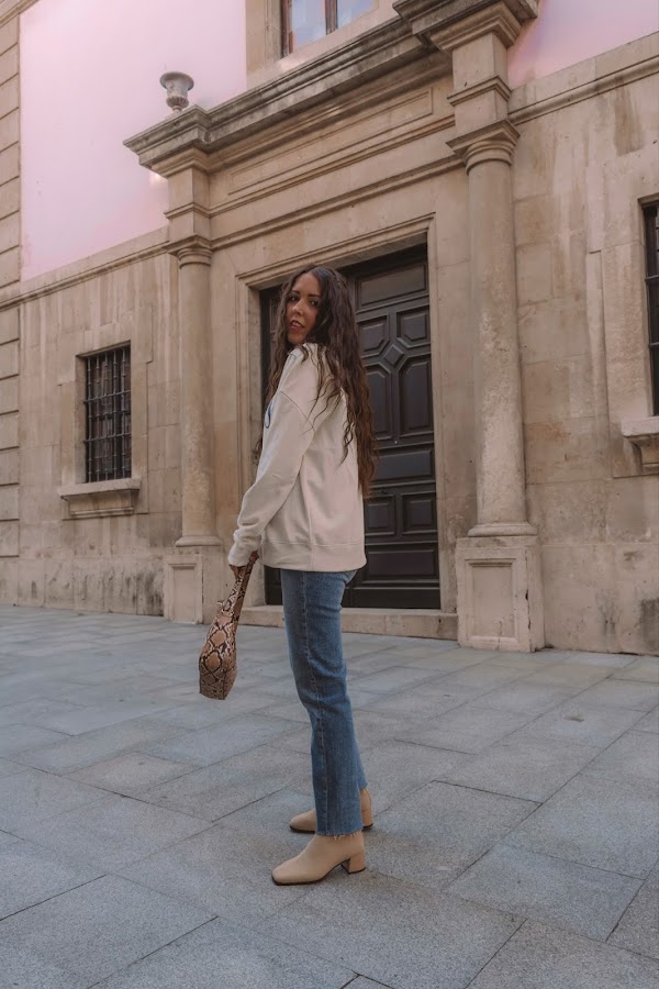 Los he combinado con una sudadera también de la misma tienda en un amarillo pálido casi beige con letras en negro. Es un look cómodo que podemos llevar con deportivas o o mocasines, pero para darle ese toque chic y restarle sport, nada como añadirle unos botines en color beige comodísimos ya que son estilo calcetín y conjuntan genial con el resto del outift. Completamos el look con el bolsito de estilo baguette de Misako y ¡listas!