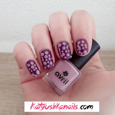 Diseño de uñas con puntos de color lila oscuro y lila claro.