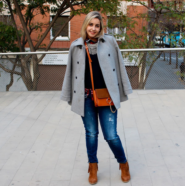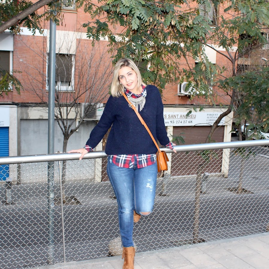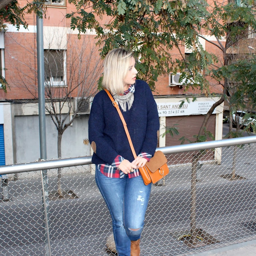 Hoy os dejo con un look casual que son los que más suelo llevar durante el fin de semana, ya que después de todo la semana llevando traje son los que más me apetecen. En el look de hoy llevo jersey azul con coderas de corazones que combine con una camisa de cuadros y mis nuevos jeans con rotos en la rodilla que son super tendencia este año. El resto de accesorios del look, mis botines con flecos, mi collar boho y mi nuevo bolso imitación del famoso bolso de Chloe, que me hice con él por 20 euros y esta muy bien conseguido y seguramente me veréis muchas veces por el blog.
