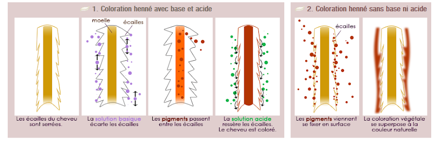 En la imagen siguiente podemos observar la diferencia entre una coloración añadiendo la loción básica antes de la aplicación de la pasta de henna y la solución ácida en el aclarado final,esquema 1,y sin añadir la solución básica ni ácida,esquema 2: